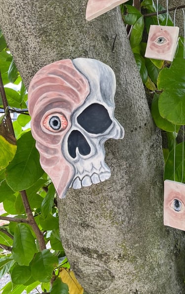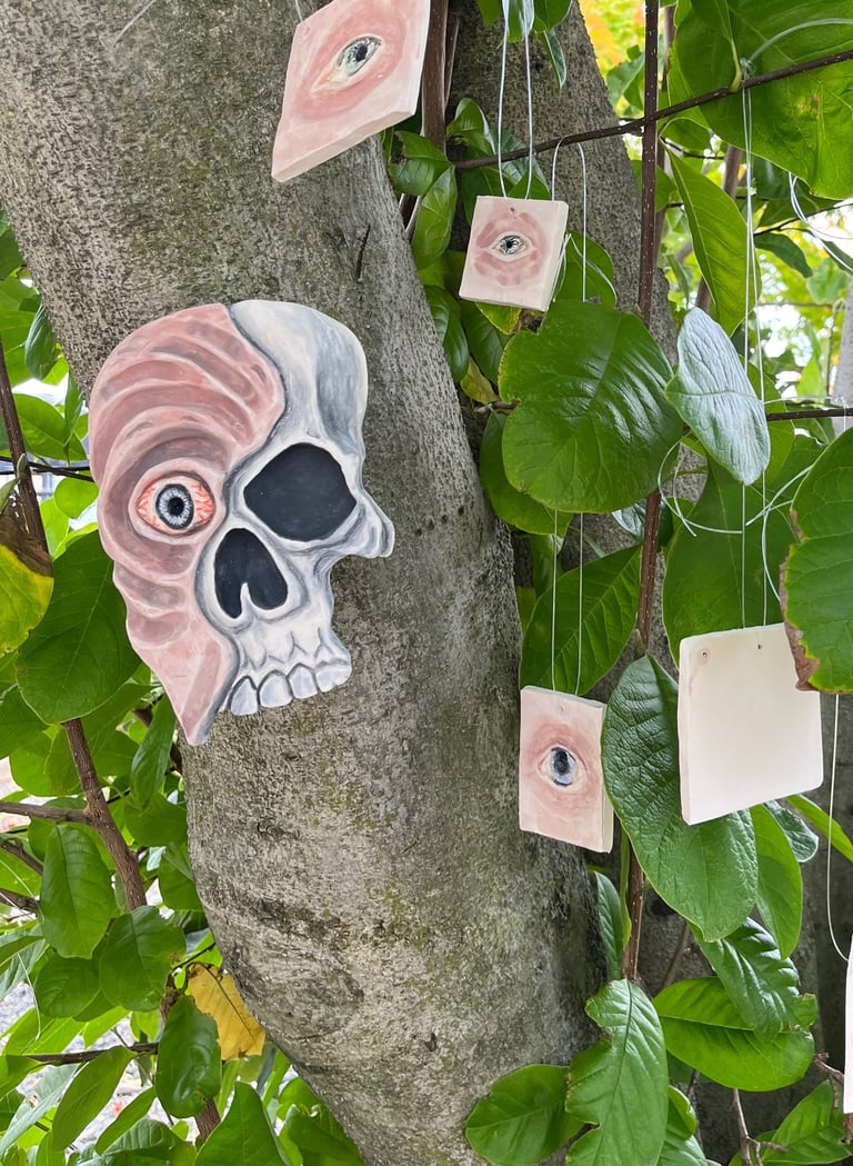 Clay, underglaze, glaze, real dead flowers, wood and photos