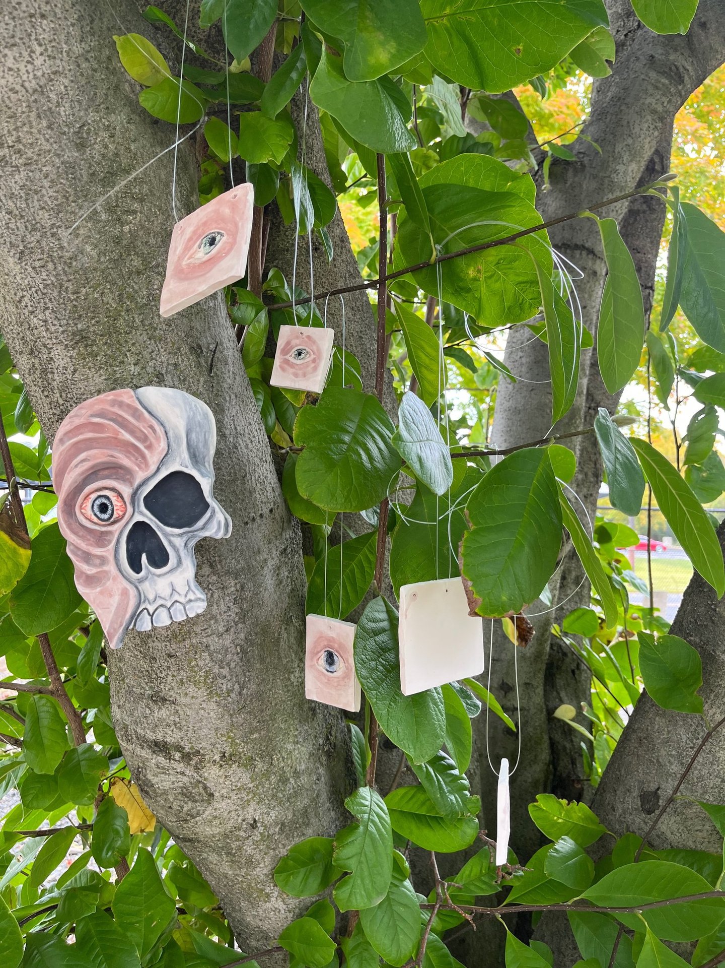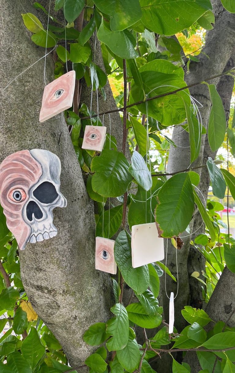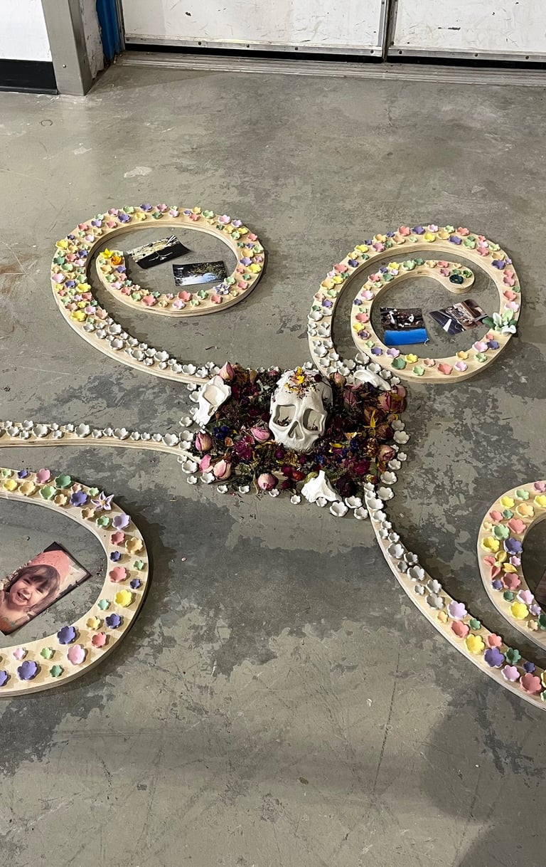 Clay, underglaze, glaze, real dead flowers, wood and photos