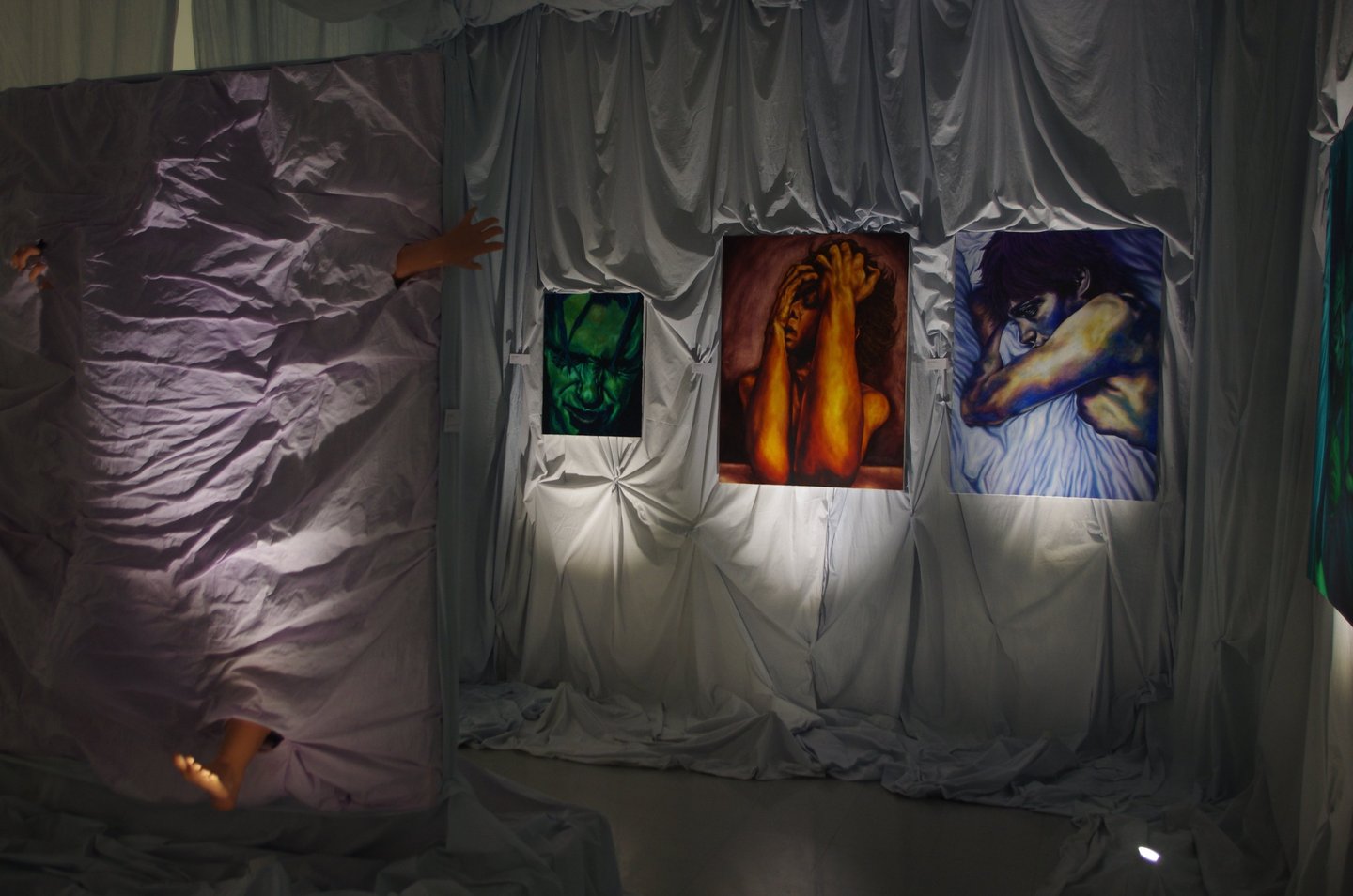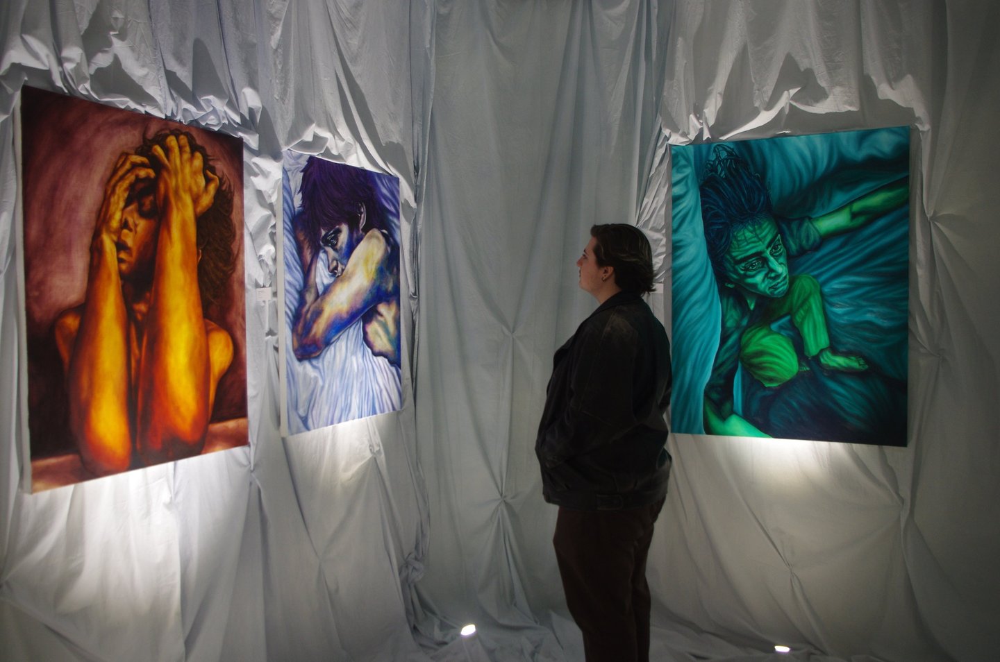 The works portray raw and unnerving emotions through the human form. Building up thin layers of paint to evoke a skin-like texture, I enhance the bodily presence of the figure, using chiaroscuro, and saturated color palettes draw the viewer in. Through my work I want to evoke a visceral or gut reaction from the viewer; a kind of uneasiness.